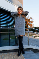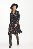 в чистый край. Горловина спинки более вырезана. Рукав втачной длинный, к низу рукав расширяется. Платье длиной выше колена.