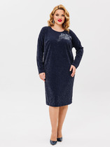 Платье прямое свободное, длиной миди. Горловина V-образной формы со стояче-отложным воротником. Плечо слегка спущено, рукав втачной, длинный. По низу рукавов отрезные манжеты с разрезами. Центральная застежка на петли и пуговицы. В боковых швах обработаны карманы. По бокам внизу обработаны разрезы. Нижний срез платья обработан швом вподгибку с закрытым срезом.