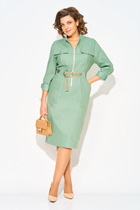 Платье А-силуэта. Горловина круглой формы с воротником стойкой. Плечо слегка спущено, рукав втачной, короткий. На детали переда вытачки. Спинка со средним швом и застежкой на потайную молнию. Нижний срез платья и рукавов обработан швом вподгибку на 2х игольной плоскошовной машине.