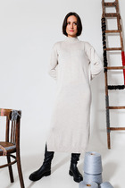 Платье А-силуэта. Горловина круглой формы с воротником стойкой. Плечо слегка спущено, рукав втачной, короткий. На детали переда вытачки. Спинка со средним швом и застежкой на потайную молнию. Нижний срез платья и рукавов обработан швом вподгибку на 2х игольной плоскошовной машине.