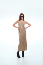 Платье изготовлено из ткани. Платье А-силуэта, длиной макси. Горловина V-образной формы, углубленная. Горловина и проймы окантованы бейкой из основного полотна. Перед и спинка со средним швом. В боковых швах обработаны карманы. Нижний срез обработан швом вподгибку.