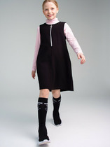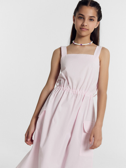 Платье для девочек свободного силуэта на бретелях. По спинке верхнего края платья внутри эластичная тесьма RV20.  Платье отрезное по талии, с кулиской. В ней пробиты петли и протянута эластичная тесьма SFKR-1, с фиксаторами SFFKR-1, образуют сборку. По боковым швам накладные карманы с клапаном. Низ платья обработан швом вподгибку.