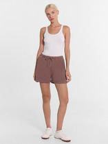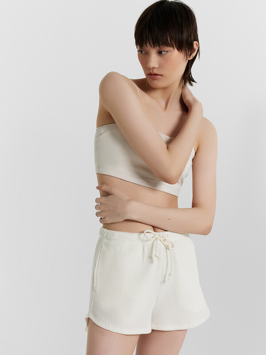 Шорты с посадкой на талии свободного силуэта. Пояс цельнокроеный с резиной внутри 30RV. По центру пояса пробиты петли, протянут шнур кругловязанный 5 мм 5KXWC-1. В боковых швах карманы. Низ изделия застрочен швом в подгибку.