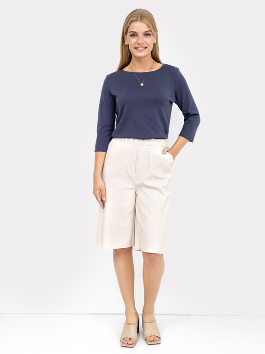 Женские шорты-бермуды из плотной и гладкой экокожи. Силуэт прямой, чуть расширяется к низу. Длина чуть выше колена. Пояс с эластичной тесьмой внутри. Есть удобные боковые карманы. Строчка на передней детали имитирует гульфик. Особенность модели – необработанные "сырые" срезы. Стильно!