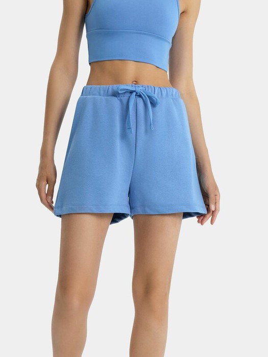 Мини-шорты свободного силуэта из легкого трикотажного футера. Высокая посадка на талии, эластичная тесьма в поясе, регулировочный шнурок-завязка и удобные боковые карманы – комфортный минимализм!