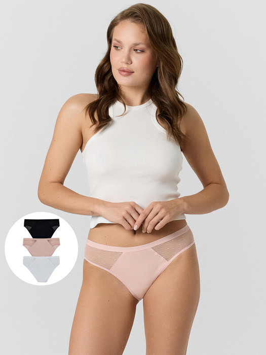 Трусы женские, средняя линия  талии, силуэт - липы. Передняя и задняя центральные детали выполнены из хлопка. Боковые детали из сетки (без боковых швов). Верхний срез трусов обработан жилкой. Нижние срезы трусов обработаны жилкой 6мм. Верхний срез подкладки ластовицы отлетной.