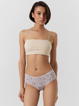 Трусы женские, средняя линия  талии, силуэт - бразилиано. Передняя и задняя детали выполнены из рибаны. Верхний срез трусов обработан бейкой поперечной из рибаны, внутри жилка 6мм. Нижние срезы обработаны бейками поперечными из рибаны. Подкладка ластовицы из хлопка, верхний срез ластовицы притачан к детали из рибаны (с изнаночной стороны имитация мужского гульфика, с лицевой стороны декоративные строчки).