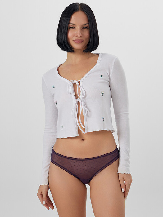 Трусы женские, средняя линия  талии, силуэт - бразилиано. Передняя и задние детали выполнены из сетки. Подкладка ластовицы из хлопка, верхний срез подкладки ластовицы отлетной. По верхнему срезу трусов и по ножкам рюша из сборки, под низом жилка.