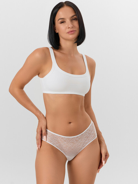 Трусы женские, средняя линия  талии, шорты. Передняя деталь выполнена из кружевного полотна. Задние детали выполнены из кружева. Подкладка ластовицы из хлопка, отлетная по верхнему срезу. Верхний срез обработан тесьмой с зубом. Нижние срезы передней детали обработаны жилкой.