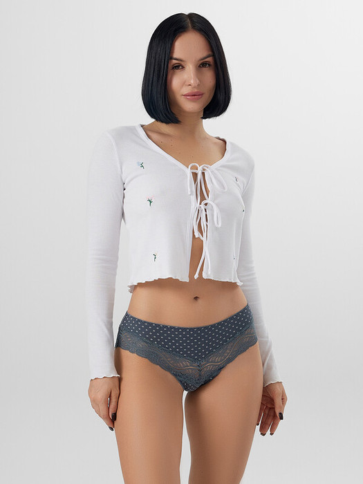 Трусы женские силуэта слип со средней посадкой из рибаны. По талии эластичная тесьма с зубом настрочена на 4-укольном зигзаге. Ножки обработаны узким кружевом шириной, на передней и задней частях со средним швом. Подкладка ластовицы из кулирной глади. Срезы ластовицы обработаны эластичной тесьмой с зубом на п/ш с изнаночной стороны.