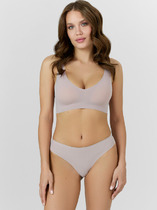 Трусы женские, средняя линия талии, силуэт - бразилиана, выполнены из трикотажного кулирного полотна в сочетании с эластичным кружевом. Передняя деталь цельная. Подкладка ластовицы из основного полотна, отлетная по верхнему срезу. Задняя деталь со средним швом, декорирована эластичным кружевом. В верхней части выполнено декоративное отверстие. Срезы кружева обработаны эл тесьмой 6 мм (жилка тканая Wt4-6 , девсел 13460 W).
