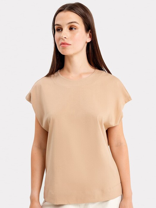 Спущенное плечо, углубленная пройма. Проймы обработаны узким швом вподгибку с плоскошовной строчкой. Низ изделия обработан широким швом вподгибку.
