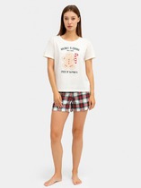 Комплект женский состоит из футболки и шорт. Футболка свободного силуэта. Горловина круглой формы, обтачка из основного полотна. Рукава втачные свободные, линия плеча слегка спущена. Низ рукавов и футболки в подгибку.