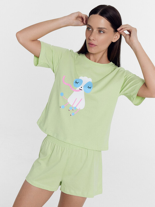 Комплект женский состоит из футболки и шорт. Футболка свободного силуэта. Горловина круглой формы, обтачка из основного полотна. Рукава втачные свободные, линия плеча слегка спущена. Низ рукавов и футболки в подгибку.