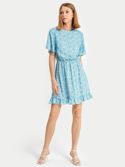 Женское полуприлегающее платье длиной выше колена из нежной и легкой вискозы. Модель отрезная по талии, внутри пояса проходит эластичная тесьма, образующая сборочки. Горловина круглая, рукава короткие и расширенные к низу. Нижний край платья украшен рюшей. На спинке застегивается на потайную молнию. Стильное платье для ваших летних образов!