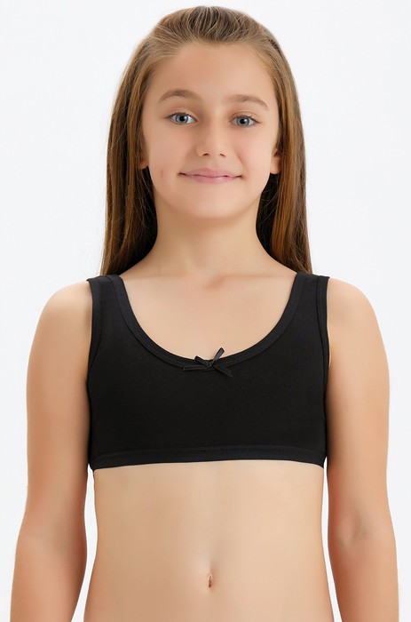 Бельевой топ сшит из трикотажного хлопка, который подойдет даже для самых чувствительных детей. Все швы подросткового бюстгальтера гладкие и не будут беспокоить ребенка во время активных занятий, в проймах мягкие эластичные бейки. Благодаря небольшому добавлению эластана топик хорошо тянется, отлично сидит по фигуре. Черный бюстик сохранит первоначальные свойства даже после многочисленных стирок.