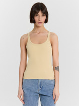 Женская майка в рубчик с вареным эффектом, круглым вырезом и широкими бретелями.