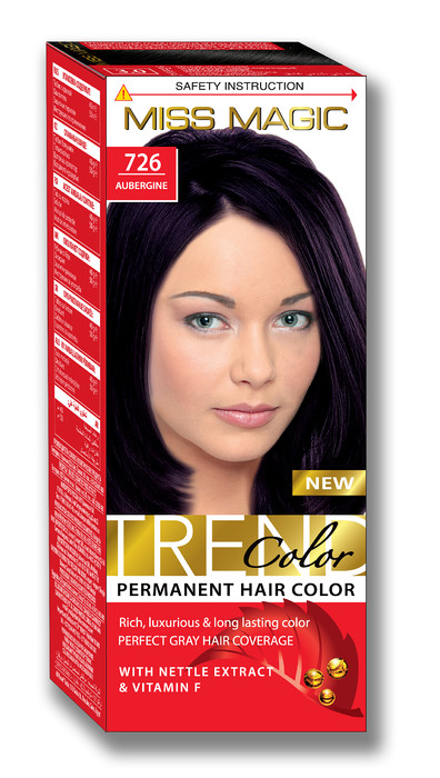 Miss Magic Trend Color краска для волос. Новая, улучшенная формула, щадящая во время окрашивания, предохраняющая волосы от обезвоживания и сохраняющая долгое время яркость цвета. В состав формулы входят витамин F и экстракт крапивы, а также эфирные масла авокадо, жожоба и миндаля. Краска обеспечивает равномерное и стойкое окрашивание, 100% закрашивание седины, удобное и быстрое применение с помощью сочетания геля-краски и окислителя. Благодаря экстракту крапивы и витаминам, волосы сохраняют мягкость, восхитительных блеск, объём и здоровый вид.