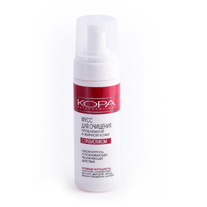 Мусс для очищения проблемной и жирной кожи с пребиотиком, имеющий приятную воздушную текстуру, разработан с учетом особых потребностей данного типа кожи.Благодаря тщательно подобранному набору компонентов мусс позволяет не только качественно очистить лицо, не забивая поры, но и восстановить природный баланс микрофлоры кожи и воспрепятствовать размножению чужеродных бактерий.Специальная щадящая формула мусса для очищения лица дает возможность без труда освободить жирную, комбинированную и проблемную кожу от излишков кожного сала и декоративной косметики, подарить ей чувство свежести и чистоты, избавить от раздражений и ощущения стянутости. Кроме того, мусс имеет лечебный эффект. Себорегулирующий комплекс, состоящий из салициловой кислоты и пребиотика лактулозы, снижает активность сальных желез, уменьшает жирный блеск, позволяет восстановить естественный кожный баланс и подавить размножение бактерий, которые провоцируют возникновение акне и воспалений. В свою очередь активный растительный комплекс успокаивает кожу, выравнивает цвет лица, избавляя его от покраснений, дарит увлажняющее и освежающее действие.Активные ингредиенты: Лактулоза, салициловая кислота, зверобой, череда, фиалка трехцветная, шалфей.Применение: Сделать одно-два нажатия на помпу и нанести полученную порцию мусса для очищения кожи на влажные лицо и шею. Распределить его по коже бережными массирующими движениями, уделяя внимание каждому участку, и смыть водой. После использования мусса рекомендуется нанести на лицо Тоник для жирной и смешанной кожи от KORA.