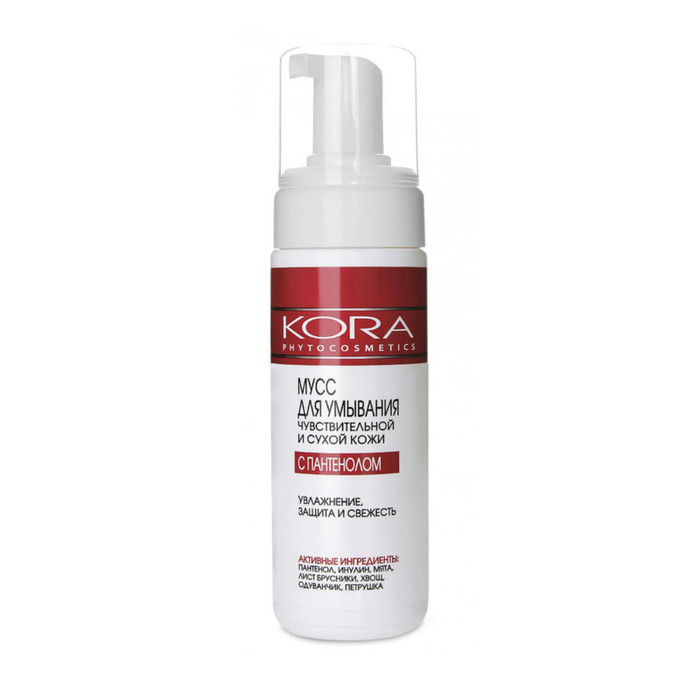 Мусс для умывания сухой и чувствительной кожи создан специально для решения основных проблем данного типа кожи. Он имеет невесомую и нежную текстуру, позволяет мягко и бережно освободить лицо от загрязнений и декоративной косметики.Не провоцирует сухости, раздражений и шелушений, не стягивает кожу. Подходит в том числе для демакияжа глаз.Изготовленный на основе мягких очищающих ингредиентов, мусс KORA для чувствительной кожи призван деликатно ухаживать за сухой, чувствительной, увядающей и возрастной кожей. Он избавит лицо от загрязнений и макияжа, не травмируя, не растягивая и не пересушивая ткани.Кроме того, натуральный полисахарид инулин в сочетании с пантенолом обеспечивают тканям мощное увлажнение, устраняя недостаток влаги, витаминов, минералов и других ценных веществ в клетках, а также восстанавливают кожу и делают ее значительно нежнее и мягче. А растительный комплекс в муссе для умывания имеет успокаивающее и тонизирующее действие, в результате которого укрепляется природный защитный барьер кожи, уменьшаются проявления раздражений, покраснения становятся менее интенсивными, лицо выглядит свежее.Активные ингредиенты: Пантенол, инулин, мята, лист брусники, хвощ, одуванчик, петрушка.Применение: Мусс имеет экономичный расход — для умывания лица и шеи достаточно одного-двух нажатий помпы. Порцию средства следует распределить по влажной коже и, совершая бережные круговые движения по массажным линиям, очистить лицо. Участкам с декоративной косметикой уделить особое внимание, при необходимости очистить их повторно. Затем нанести на лицо Тоник для сухой и чувствительной кожи от KORA и крем.