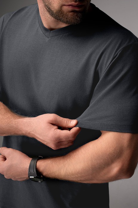 Классическая футболка с V-образным вырезом — неотъемлемый элемент в конструкторе твоего стиля! Глубокий темно-серый цвет подчеркивает мужественность и добавляет образу харизмы.