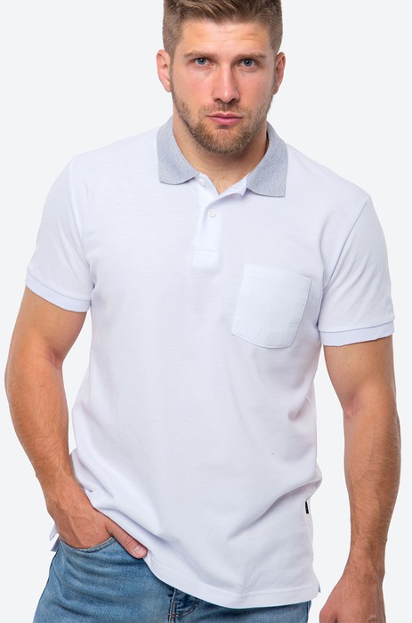 Белая футболка поло с серым воротником — лаконичный фаворит мужского гардероба, который всегда к месту. Идеальный баланс между комфортом и стильным минимализмом для повседневных образов.