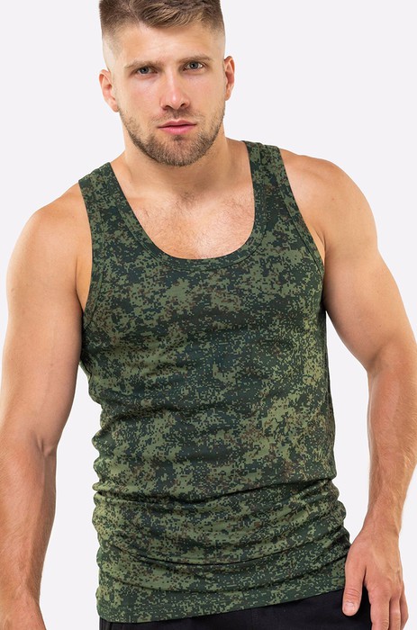 Мужская майка классического кроя выполнена из 100% хлопка. Летняя майка с камуфляжным рисунком цифра защитного зеленого цвета предназначена для мужчин и парней, предпочитающих стиль милитари. Спинка-борцовка делает майку идеальной для активного образа жизни.