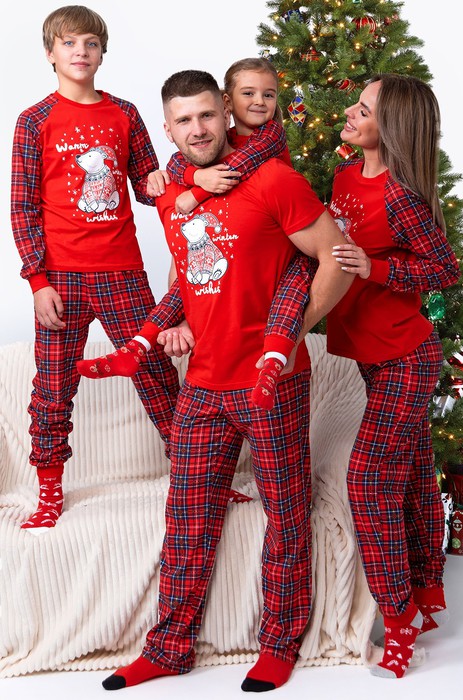 Мужская пижама с брюками создана для комфорта и праздничного настроения. Домашний костюм красного цвета выполнен из 100% хлопка, ткань кулирная гладь. Трикотажная пижама в клетку украшена принтом Мишка в колпачке.