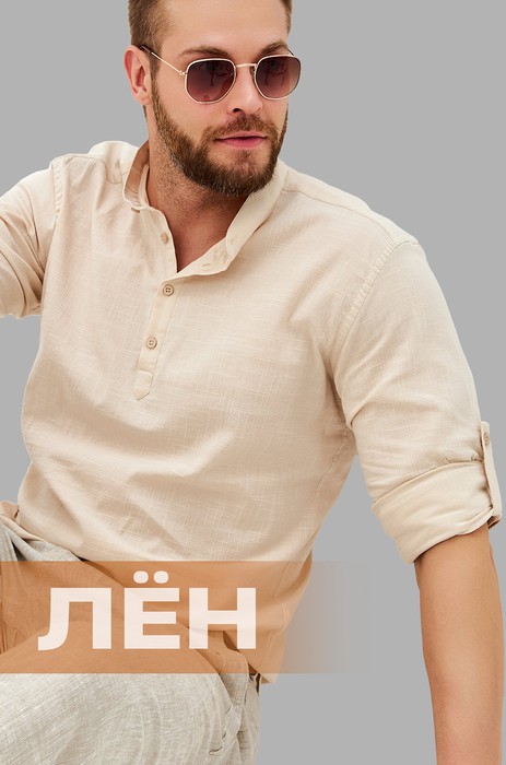 Мужская рубашка выполнена из хлопка и льна! Базовый бежевый цвет, застежка на классические пуговицы и длинные рукава в сочетании с воротником-стойкой превратят каждый образ с этой рубашкой для мужчин в брутальный и лаконичный.