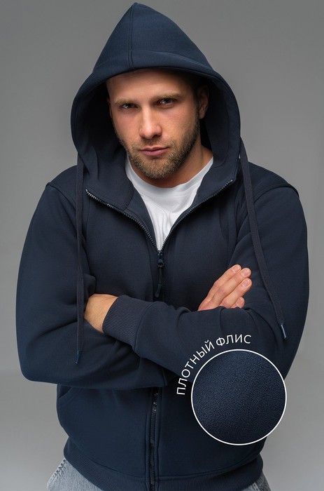 Откройте для себя идеальную мужскую толстовку – надежного напарника в прохладные дни! Темно-синее худи на молнии не только согреет, но и подарит комфорт благодаря продуманным деталям, таким как капюшон и карман кенгуру.