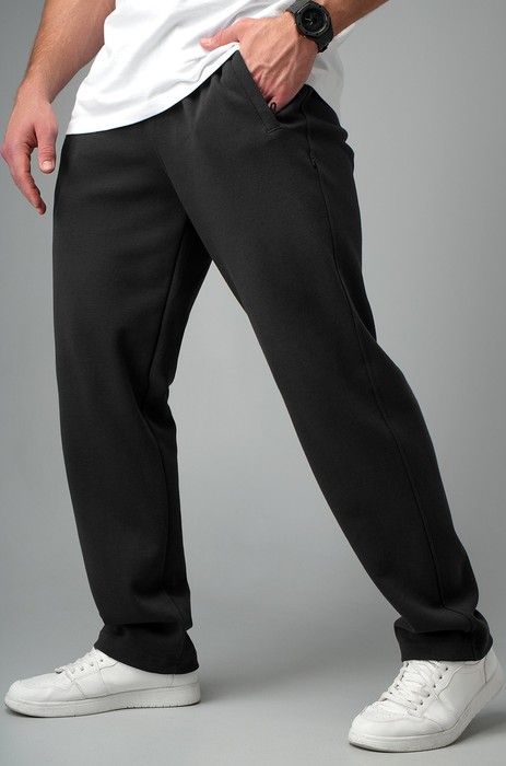 Прямые трикотажные брюки с лаконичным кроем и скрытым шнурком в поясе — это про удобство без компромиссов. Карманы добавляют практичности, а свободная посадка позволяет двигаться без ограничений. То, что нужно для бега, активного отдыха или неспешных дел в городе. Однотонные черные спортивки незаменимы в летних образах. Трико для мужчин подойдут для весны.