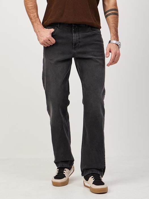 Мужские классические джинсы с пятью карманами. Посадка Comfort fit (свободные по бедру), широкие в колене и по низу, высокая талия. Застежка на молнии. Выполнены из слабоэластичной ткани denim comfort stretch, цвет ткани Black/Black (лицевая и изнаночная стороны ткани черные). Темная стирка с потёртостями и "усами" спереди и потёртостями сзади.