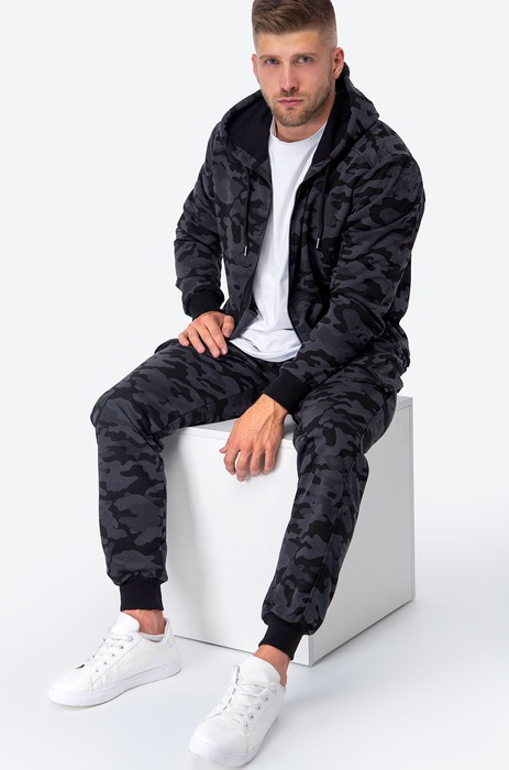 Мужской спортивный костюм выполнен из 100% хлопка, плотного футера трехнитки. Демисезонный камуфляжный костюм состоит из толстовки с капюшоном и брюк джоггеров. Мастерка с застежкой на молнию и карманами, капюшон регулируется по объему. Штаны дополнены карманами, пояс утягивается шнуром, по низу расположены эластичные манжеты.