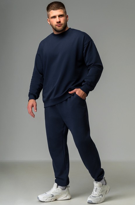 Хлопковый костюм станет надежным спутником на тренировках и в повседневной жизни. Демисезонный синий костюм двойка состоит из толстовки и брюк.
