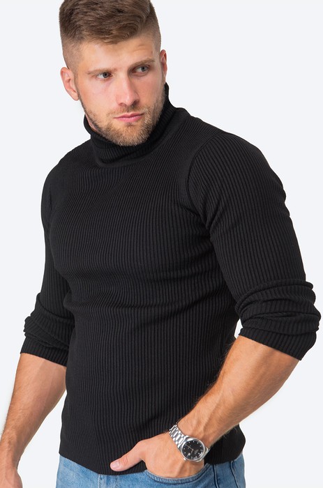 Стильная черная водолазка с высоким воротником для мужчин выполнена из вязаного трикотажа: в ней будет уютно и тепло в прохладную погоду. Шерстяной джемпер в рубчик из мягкой пряжи с акрилом не колется, он невероятно мягкий и приятный к телу. Благодаря фактурной вязке теплая водолазка хорошо тянется.