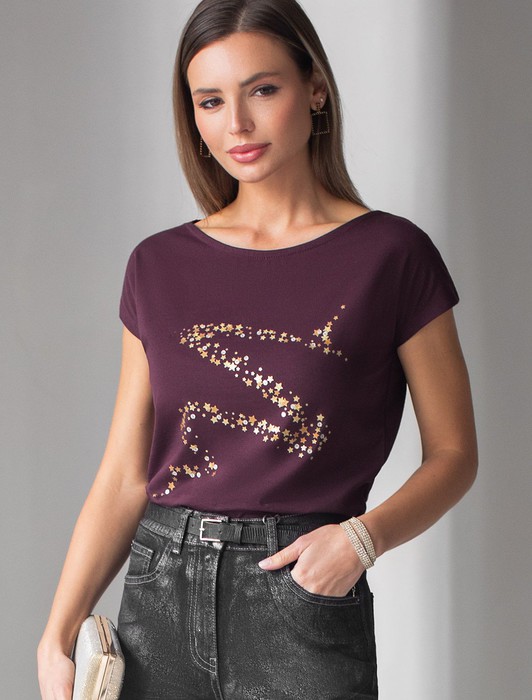 Женская футболка подчеркнет вашу индивидуальность и позволит вам выглядеть привлекательно в любой ситуации. Легкость в уходе и высокая износостойкость делают ее незаменимой вещью в вашем гардеробе. Благодаря сочному дизайну и качественной отделке, футболка легко сочетается с различными элементами гардероба, позволяя создавать уникальные комплекты для разных случаев. Она станет ярким акцентом в вашем гардеробе и подарит уверенность на любом событии. Такой вариант одежды станет отличной базой для стильного и эффектного образа на праздничное событие, корпоратив, Новый Год.