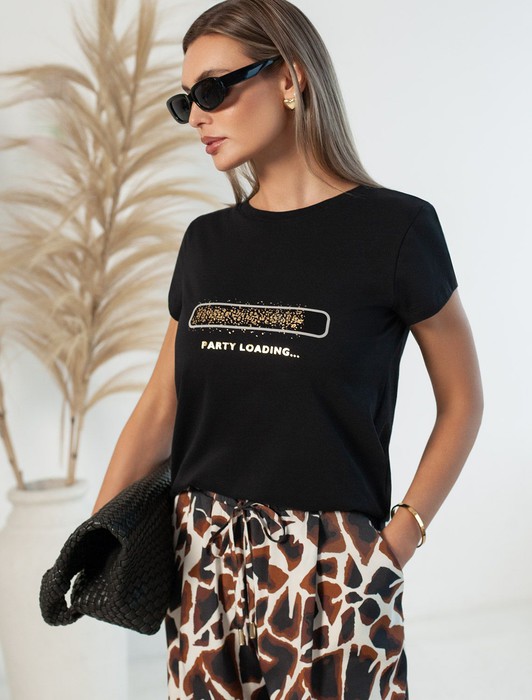 Состав: 92%Хлопок 8%ПУ Плотность: 150 Г/м2Футболка черного цвета идеально подходит для вечеринки и создания яркого образа. Оригинальный принт из золотистой фольги придает изделию шикарный вид, который привлечет внимание на любом мероприятии. Модель с круглым вырезом и классическим коротким рукавом обеспечивает свободу движений и комфорт в носке. Такой фасон изделия подходит на большие размеры, гармонично сидит на фигуре и помогает создать легкий акцент на достоинствах. Аккуратный круглый вырез красиво подчеркивает шею и делает образ элегантным, сохраняя актуальность для разных случаев — от рабочих встреч до вечерних прогулок и праздничных мероприятий.