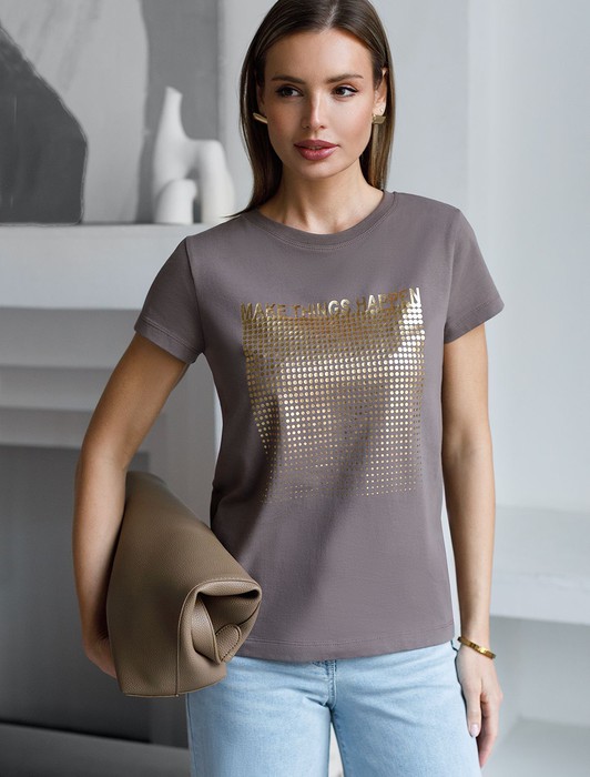 Состав: 92%Хлопок 8%ПУ Плотность: 150 Г/м2Футболка кофейного цвета идеально подходит для вечеринки и создания яркого образа. Оригинальный принт из фольги золотистого цвета придает изделию шикарный вид, который привлечет внимание на любом мероприятии. Модель с круглым вырезом и классическим коротким рукавом обеспечивает свободу движений и комфорт в носке. Такой фасон изделия подходит на большие размеры, гармонично сидит на фигуре и помогает создать легкий акцент на достоинствах. Аккуратный круглый вырез красиво подчеркивает шею и делает образ элегантным, сохраняя актуальность для разных случаев — от рабочих встреч до вечерних прогулок и праздничных мероприятий.