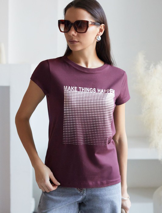 Эта нарядная футболка подходит для создания образа на каждый день и идеально подойдет на выход. Модель не мнется, что делает ее практичным вариантом для активных женщин, которые ценят стиль и удобство.