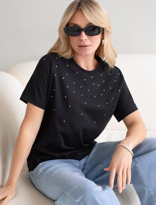 Состав: 92%Хлопок 8%ПУ Плотность: 170 Г/м2Стильная базовая футболка черного цвета с принтом стразами выполнена из плотного хлопка с эластаном для комфортной посадки на любую фигуру. Прямая футболка классического кроя с круглым вырезом, прекрасно подходит для разных типов фигуры, в том числе и на большие размеры. Мягкость хлопка вместе с небольшой долей эластана гарантирует идеальную посадку и свободу движений. Легкая натуральная дышащая ткань премиального качества делает футболку с коротким рукавом идеальным вариантом для повседневной носки дома, на работу или офис. Однотонная футболка дополнена авторским аккуратным принтом, который придает праздничный и элегантный вид без лишней вычурности. Блестящий принт в виде россыпи страз аккуратно украшает, добавляя изысканный акцент и создавая легкий мерцающий эффект.