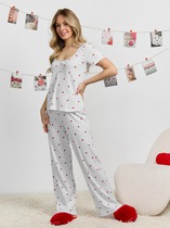Сорочка женская из трикотажного полотна «кулирка» с набивным рисунком, свободного покроя, расширенная книзу, с короткими втачными рукавами и горловиной фигурной формы. Полочка – с притачной кокеткой V-образной формы, состоящей из двухч астей. Нижняя, основная деталь полочки присборена по шву стачивания с кокеткой. Низ рукавов, горловина и кокетка отделаны кружевом. В центре кокетки – два декоративных бантика из узкой атласной ленты