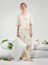 Сорочка женская из трикотажного полотна «кашкорсе» с набивным рисунком, полуприталенного силуэта, с короткими втачными рукавами, углубленной формой горловины, по центру которой выполнена небольшая сборка. Низ изделия и нижние срезы рукавов обработаны подгибкой, срез горловины - эластичной тесьмой с фасонным краем, в центре настрочен узкий декоративный бантик.