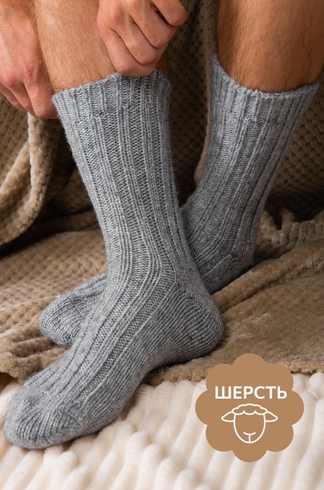 Мужские серые носки выполнены из приятной к телу шерстяной пряжи. Однотонные высокие носки идеальны для уютных осенних вечеров и зимних прогулок. Теплые носки украшены вывязанным вертикальным рубчиком.