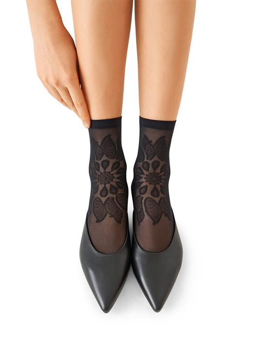 Женские фантазийные носки SiSi c ажурным кружевным рисунком и стразами. Комфортно ощущаются на ноге в течение всего дня и превосходно облегают, благодаря эластану в составе и удобной резинке. Невидимый усиленный мысок обеспечивает дополнительную прочность.