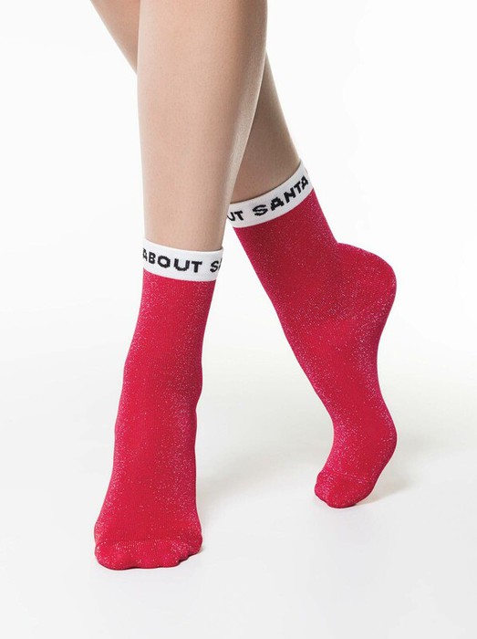 Новогодние носки с люрексом и вывязанной надписью на резнике станут стильным дополнением праздничного образа или оригинальным подарком для девушек, которые любят составлять индивидуальные аутфиты.