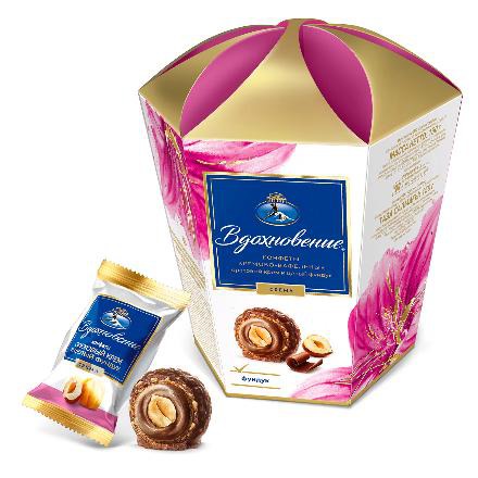 Конфеты «Вдохновение» с шоколадно-ореховым кремом и целым фундуком – прекрасный вариант сладкого подарка. Под шоколадной глазурью с измельченными орешками прячется тонкая хрустящая вафля с ядрышком фундука, укутанного нежным шоколадно-ореховым кремом. Утонченный вкус шоколада «Вдохновение», тающий крем, обнажающий хрустящий орешек – эти конфеты действительно вдохновляют!