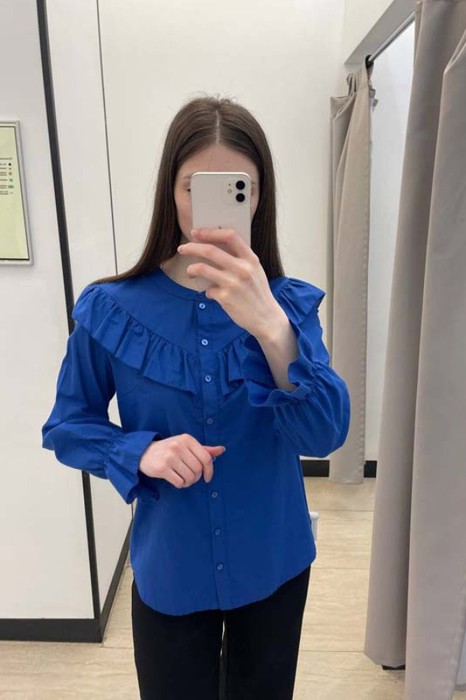 Блуза полуприлегающего силуэта с притачной планкой и застёжкой на пуговицы. Изделие из хлопковой ткани. На передней и задней части изделия выполнена кокетка с рюшей. Линия горловины оформлена плоским воротником в виде обтачки. Втачной рукав в романтическом стиле, присборен на резинку.