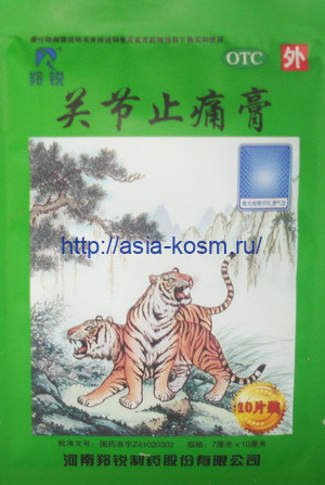 В упаковке 10 пластырей. Состав: анис, дудник китайский, имбирь лекарственный, мята перечная, трава эфедры, борнеол, искусственный мускус, кости леопарда, камфара, плоды боярышника, дриобаланопс ароматный (камфарное дерево), Аконит Кармишеля, Аконит Кузнецова, корень дудника даурского, корневище атрактилодеса ланцетного, хондроитин сульфат, эфир салициловой кислоты, димедрол. Применение: обезболивающее, противовоспалительное. Используется для лечения ревматических болей, болях в суставах, пояснице, болях неврологического характера; также применяется при мышечных болях, растяжениях, вывихах, переломах. Пластырь предназначен для устранения болей в суставах. Активные составляющие, изготовленные из лекарственных растений, собранных в экологически чистых районах, быстро проникают в места локализации болевых ощущений. Восстанавливают и ускоряют микроциркуляцию крови в пораженных суставах, снимают воспалительные процессы и способствуют выведению солей, токсинов и свободных радикалов из пораженного сустава. Применение: Наклеивать на больное место на 12-24 часа.