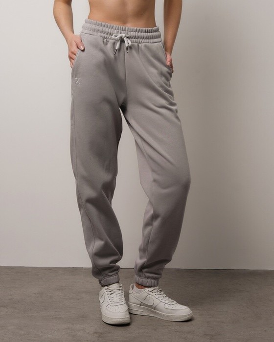 Джоггеры свободного кроя с боковыми карманами, собранные внизу. Широкий эластичный пояс со шнуром.