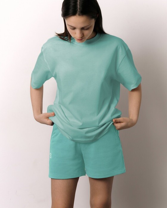 Футболка свободного кроя, втачной рукав. Горловина окантована бейкой из рибаны
